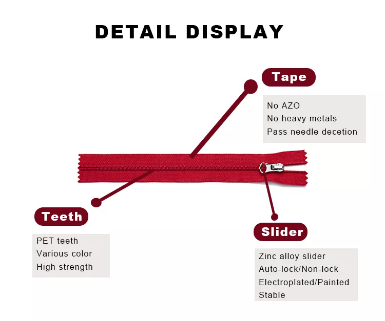 De TRC-standaard nylon rits is vervaardigd met behulp van polyesterweefsel en zeer sterke nylon tanden, wat een lichtgewicht duurzaamheid en een soepele werking biedt. Ze vertegenwoordigen het meest gebruikte type ritssluiting.