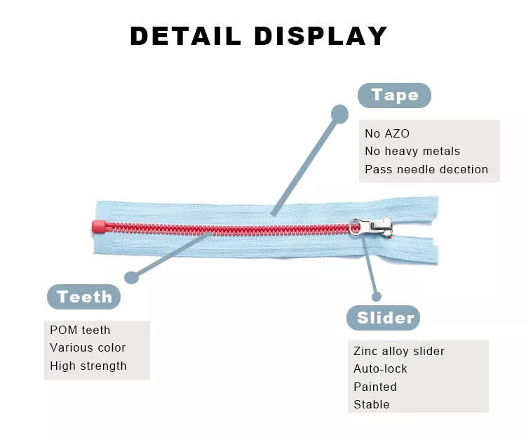 De TRC-standaard plastic ritssluiting is spuitgegoten uit polyoxymethyleen of andere hoogwaardige harsmaterialen, wat ervoor zorgt dat de tanden goed gevormd zijn en tegelijkertijd een uitstekende gladheid en uitstekende slijtvastheid biedt tijdens gebruik. Hun oppervlakken ondersteunen verschillende kleurbehandelingen met een uitstekende kleurechtheid, waardoor de kleuren lang levendig blijven. Bovendien is de algehele structuur, in combinatie met zeer sterke polyestertape, steviger en duurzamer en voldoet aan de eisen van veelvuldig dagelijks gebruik.
